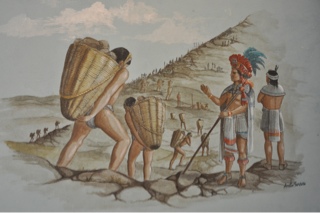 You'll see an artist's conception of of a market near a pyramid. A man is flattening paper for sale. The woman is selling jewelry. In another photo you can see how the pyramids were constructed on the backs of men.